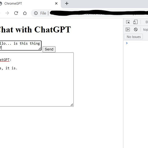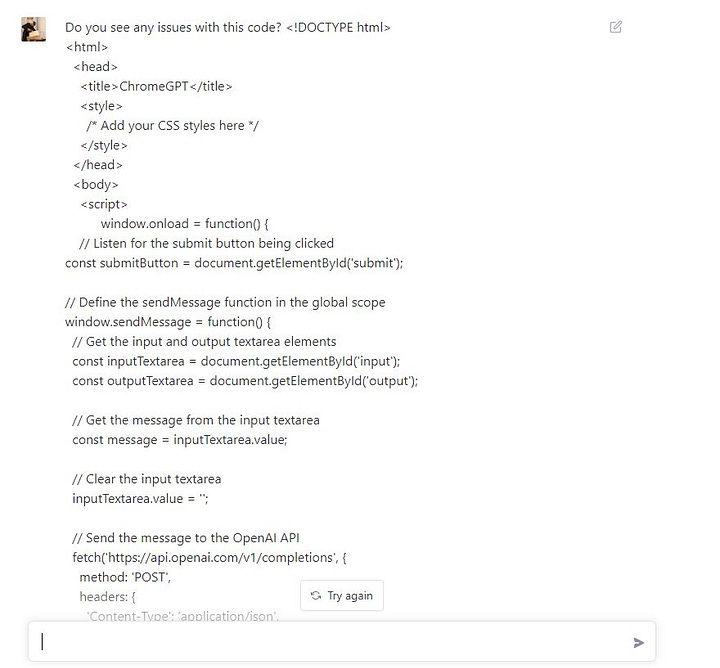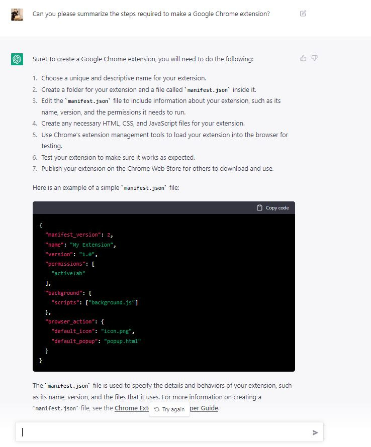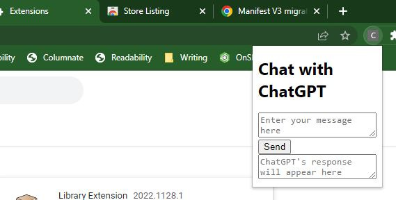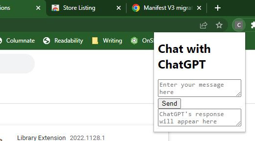 Then, on Friday evening after work, I decided to chat with my new friend ChatGPT again. This time, I had a different goal in mind. I wanted to see if ChatGPT could help me program a browser extension for Google Chrome. Because of my vision of an AI assistant that was with you at all times, my idea was to use ChatGPT to help me build a way to use ChatGPT without having to pull up OpenAI's site in a separate tab. I wanted a quick extension window that could send messages to ChatGPT and receive replies, so that your AI partner was with you anywhere on the web.