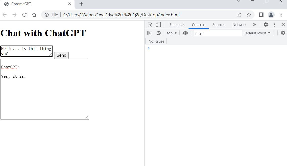 In a single working session, I was able to code the basic product and send and receive messages using OpenAI's API. This was the magic moment my code worked:
